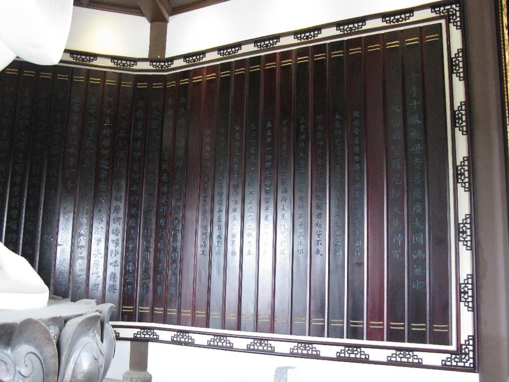 ? ? ? 金粟寺大悲阁一楼背景墙面采用大型仿古木雕《千手千眼观世音菩萨广大圆满无碍大悲心陀罗尼经大悲神咒》装饰。木雕高4.8米、宽18.36米,上下采用古代竹简方式,古朴庄严、气势恢宏。整件作品由中国木雕之乡东阳雕刻大师捉刀,雕工精美、刀法老练,字体朴拙、骨架劲挺